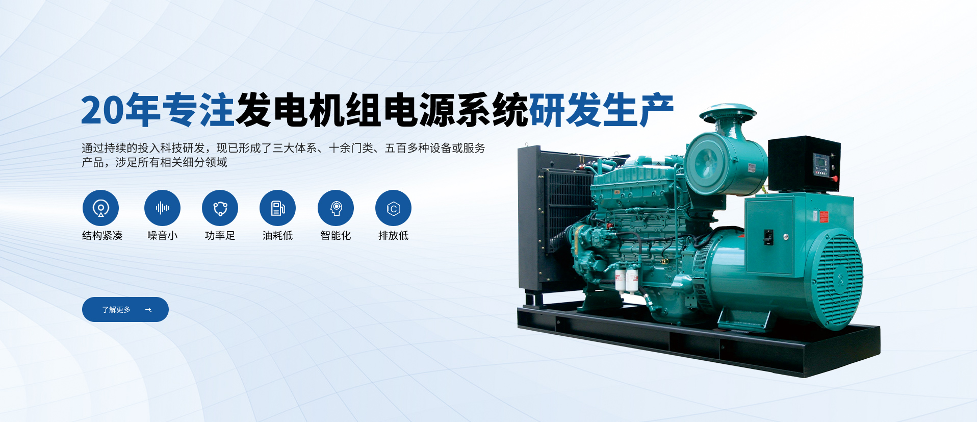 公司一直專注于高品質(zhì)發(fā)電機組及配套設(shè)備的研發(fā)、生產(chǎn)、銷售和售后服務(wù),致力于為用戶提供完美的產(chǎn)品和服務(wù)。從全球知名配套廠商優(yōu)選零部件及組件,優(yōu)勢組合,打造名牌發(fā)電機組產(chǎn)品。公司在全國設(shè)立多處銷售服務(wù)網(wǎng)點,體系遍布全國大中城市。